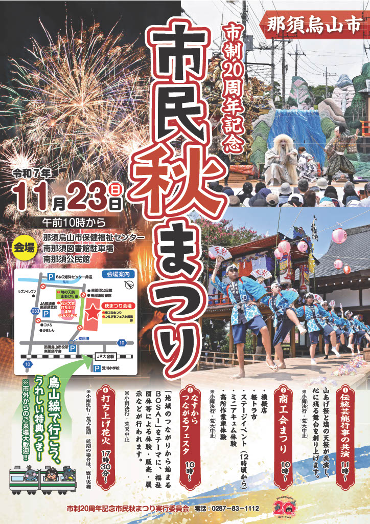 【お問い合わせ】 市制20周年記念市民秋まつり実行委員会(市総合政策課内) 電話番号:0287-83-1112